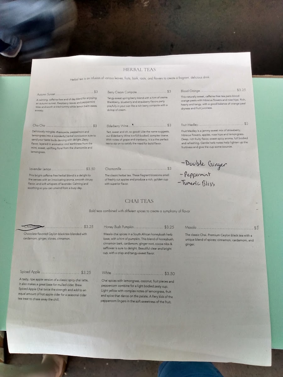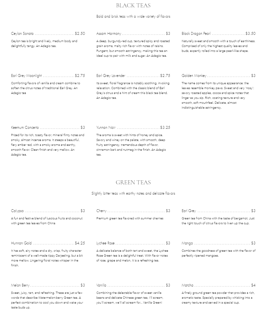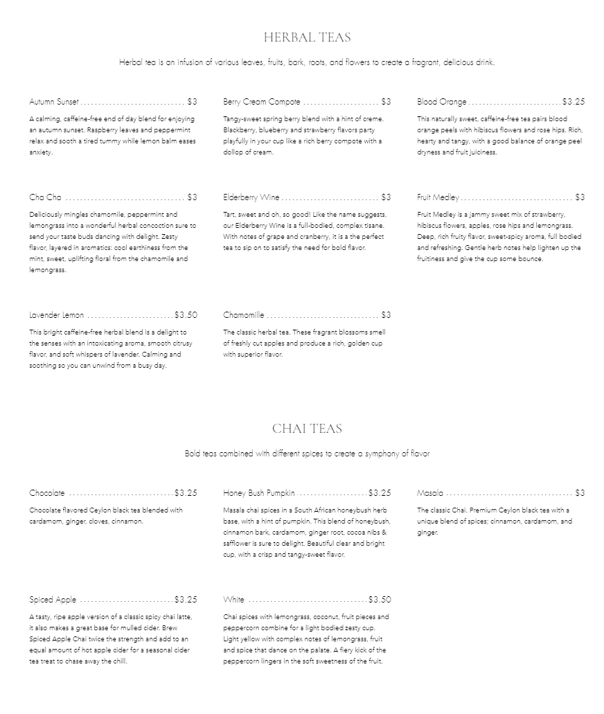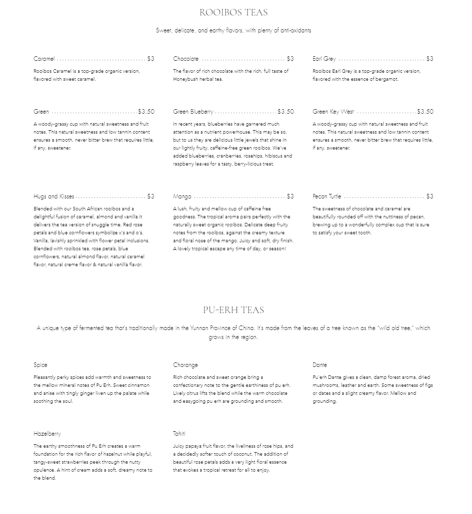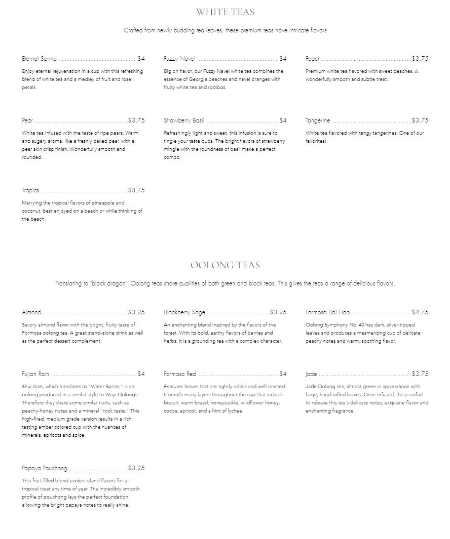 Fleur De Tea in Prospect, KY offers a menu that caters to tea enthusiasts and casual drinkers alike, presenting an extensive and thoughtfully curated selection. For tea lovers, options range from robust black teas like Assam and Irish Breakfast to fragrant green teas such as Calypso and Lychee Rose, while white teas including Eternal Spring and Fuzzy Navel provide a delicate alternative. Oolong fans can enjoy Almond or Jade, and the Rooibos collection features vibrant flavors like Blueberry and Earl Grey Mango. Those seeking something richer or unique might gravitate toward Pu-Erh varieties like Spice or Tahiti Hazelberry, or soothing herbal blends such as Berry Cream Compote and Chamomile. The menu also highlights specialty Chai Teas, including Golden Tumeric and Masala, as well as a playful bubble tea section with flavors like Coffee, Peach, and Coconut. For coffee aficionados, classics such as Espresso, Doppio, and Americano sit alongside frothy options like Latte, while tea can be customized to Make it a Latte, Make it Strong, or Make it a Teapot. Across the board, the menu balances familiar favorites with adventurous selections, ensuring every guest finds a drink that suits their mood and taste.